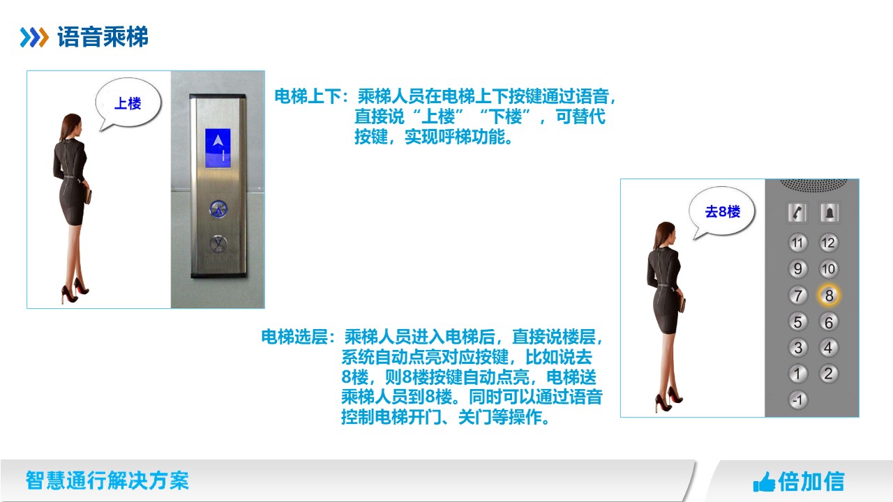 電梯上下:電梯一般都需要按電梯外面上下按鍵實(shí)現(xiàn)呼梯,倍加信語音識別乘梯方案,乘梯人員在電梯上下按鍵通過語音,直接說“我要上樓”“我要下樓”可替代按鍵,實(shí)現(xiàn)呼梯功能。