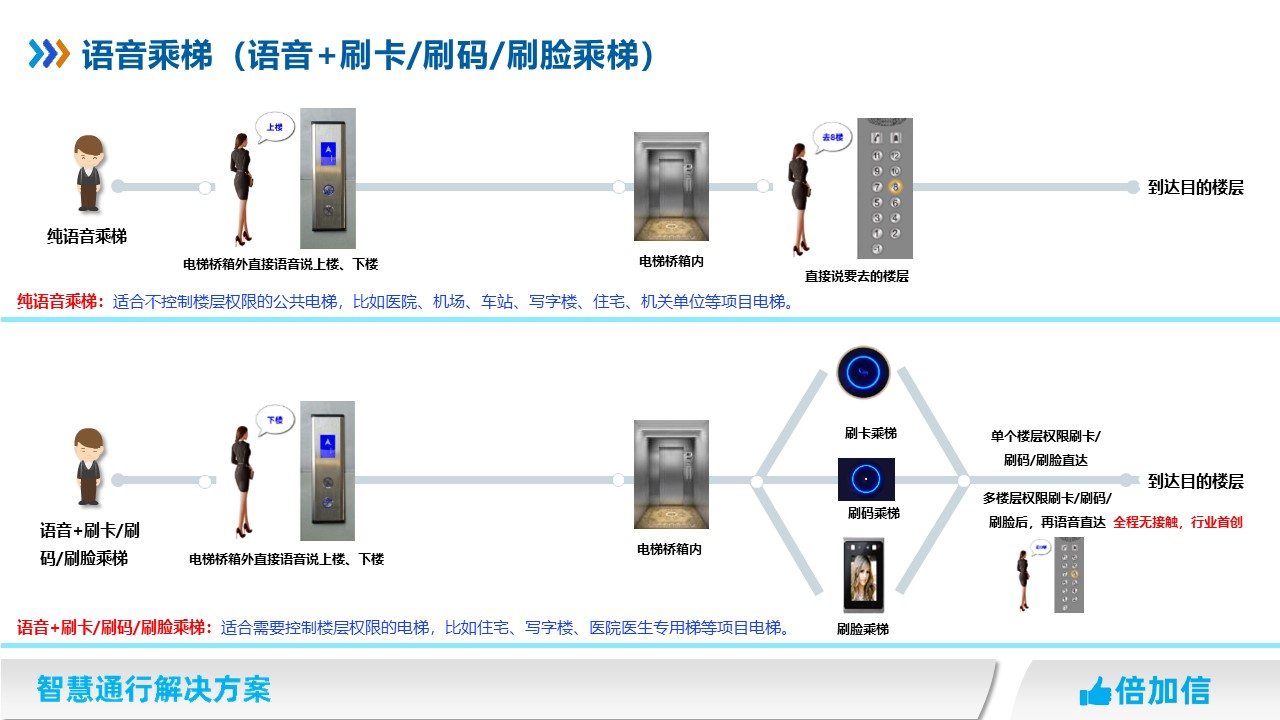 倍加信科技作為專業(yè)的梯控系統(tǒng)研發(fā)廠家,推出真正零接觸的乘梯方案。不判斷樓層權(quán)限,全程通過語音識別實(shí)現(xiàn)呼梯和乘梯。