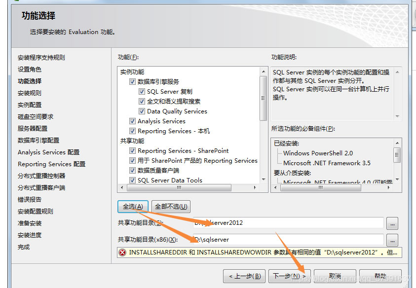 建議全選;由于SQL占用空間較大,本機(jī)修改了功能目錄存儲(chǔ)位置;