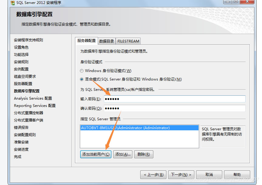 Analysis Services配置,選擇“添加當(dāng)前用戶”;