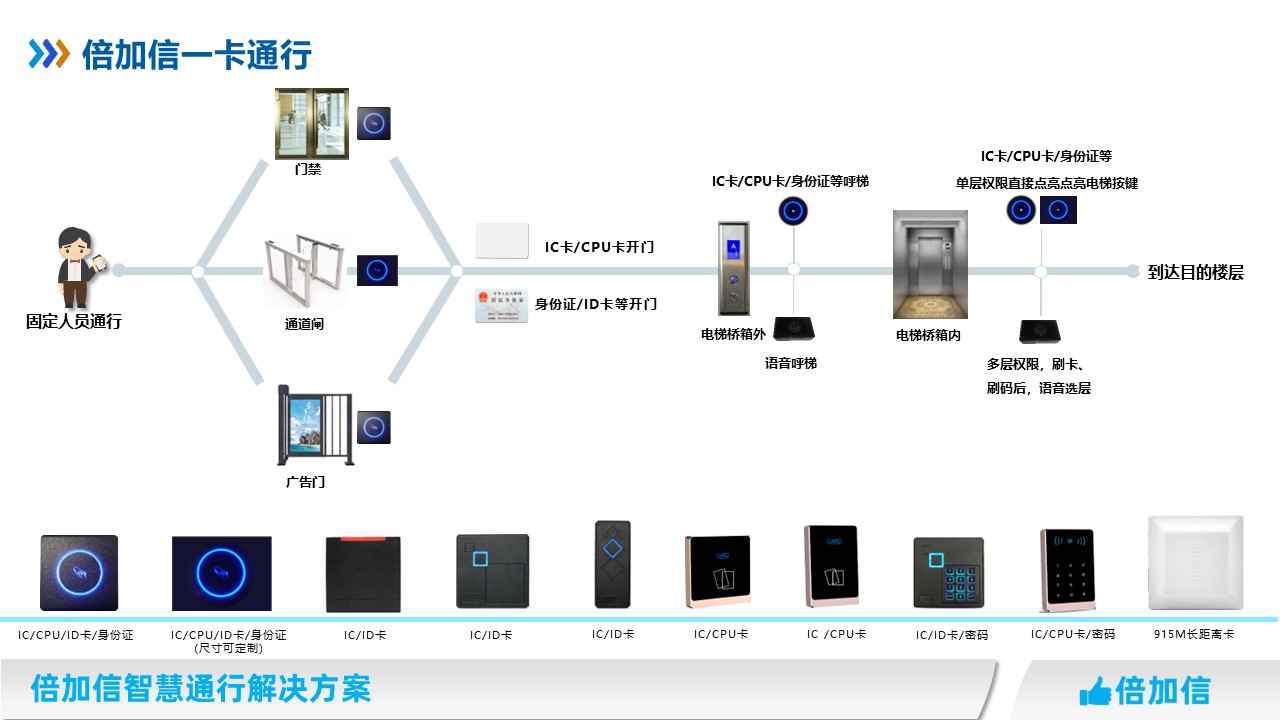 倍加信一卡通解決方案 一次發(fā)卡通行門禁、通道閘、梯控等系統(tǒng)