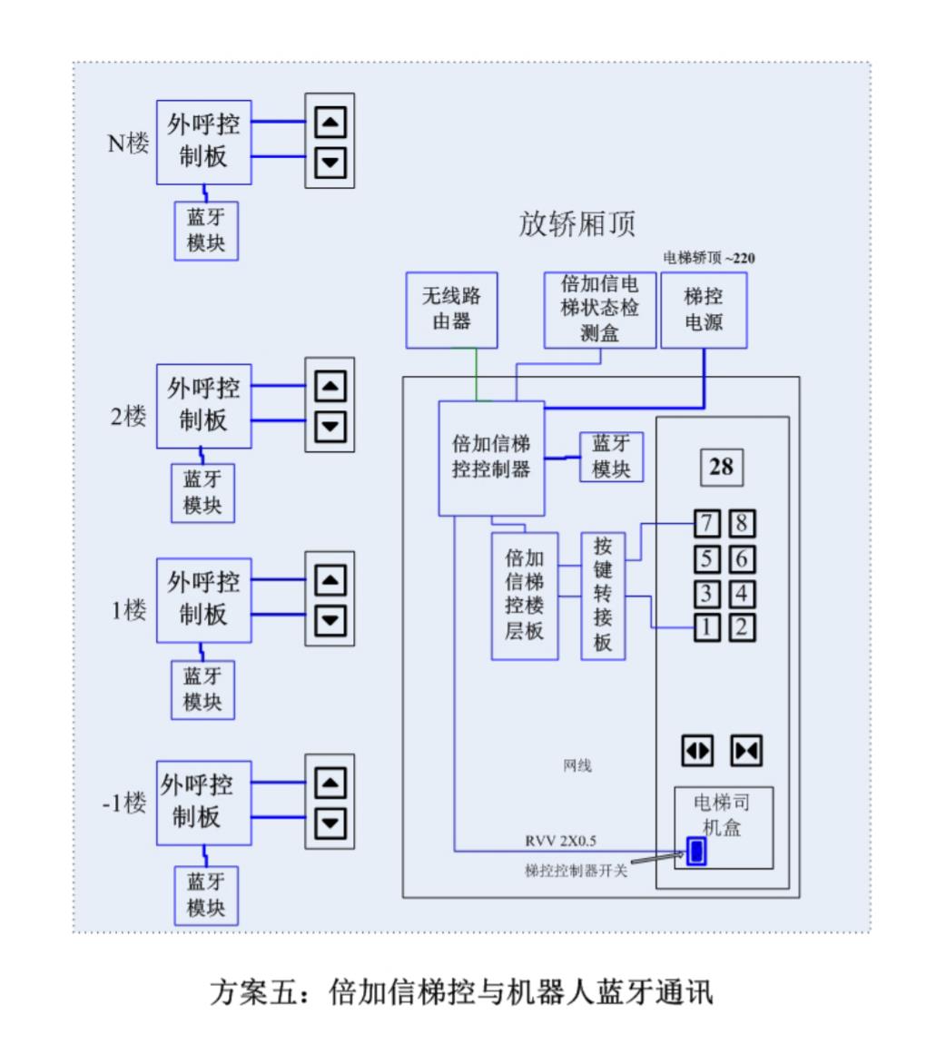 (1)機器人在電梯外,通個藍牙連接發(fā)送指令倍加信梯控系統(tǒng),系統(tǒng)自動點亮上樓或下樓按鍵,實現(xiàn)呼梯功能。
