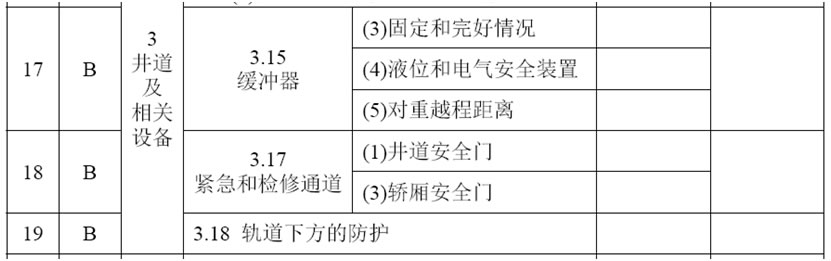 (17)增加3.18項(xiàng),項(xiàng)目及類別為:“軌道下方的防護(hù) B”,檢驗(yàn)內(nèi)容與要求為:“如果人員可以進(jìn)入電梯運(yùn)行軌道的下方,應(yīng)當(dāng)設(shè)置無(wú)孔的防護(hù)隔障,以擋住和收納可能從斜行電梯上掉落的碎片或者零件”;