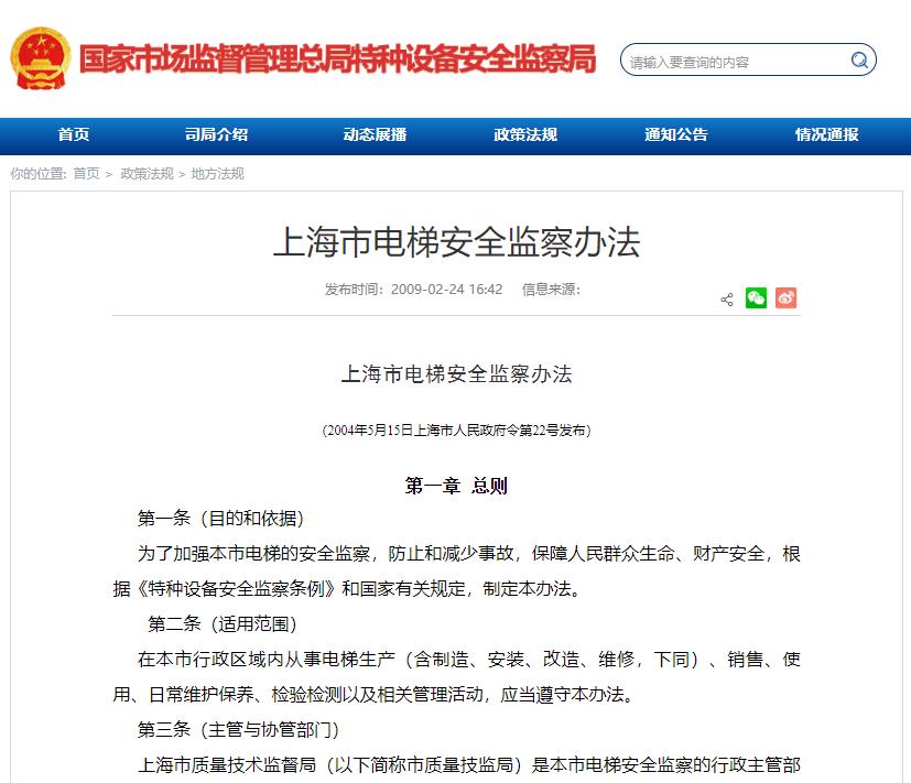 上海市質(zhì)量技術(shù)監(jiān)督局(以下簡(jiǎn)稱(chēng)市質(zhì)量技監(jiān)局)是本市電梯安全監(jiān)察的行政主管部門(mén)。區(qū)(縣)質(zhì)量技術(shù)監(jiān)督局(以下簡(jiǎn)稱(chēng)區(qū)(縣)質(zhì)量技監(jiān)局)負(fù)責(zé)本行政區(qū)域內(nèi)電梯的安全監(jiān)察工作。