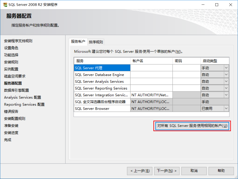 點擊,對所有SQL Server服務(wù)使用相同賬戶