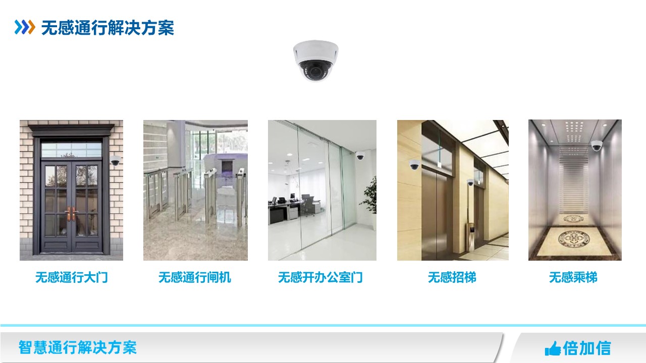 在高檔住宅、寫字樓、企事業(yè)單位等場所,開門、過閘機、招梯、乘梯等要求通行更加智能化,無需刷卡、刷碼、不需要主動刷臉識別等,就可以無感通行。